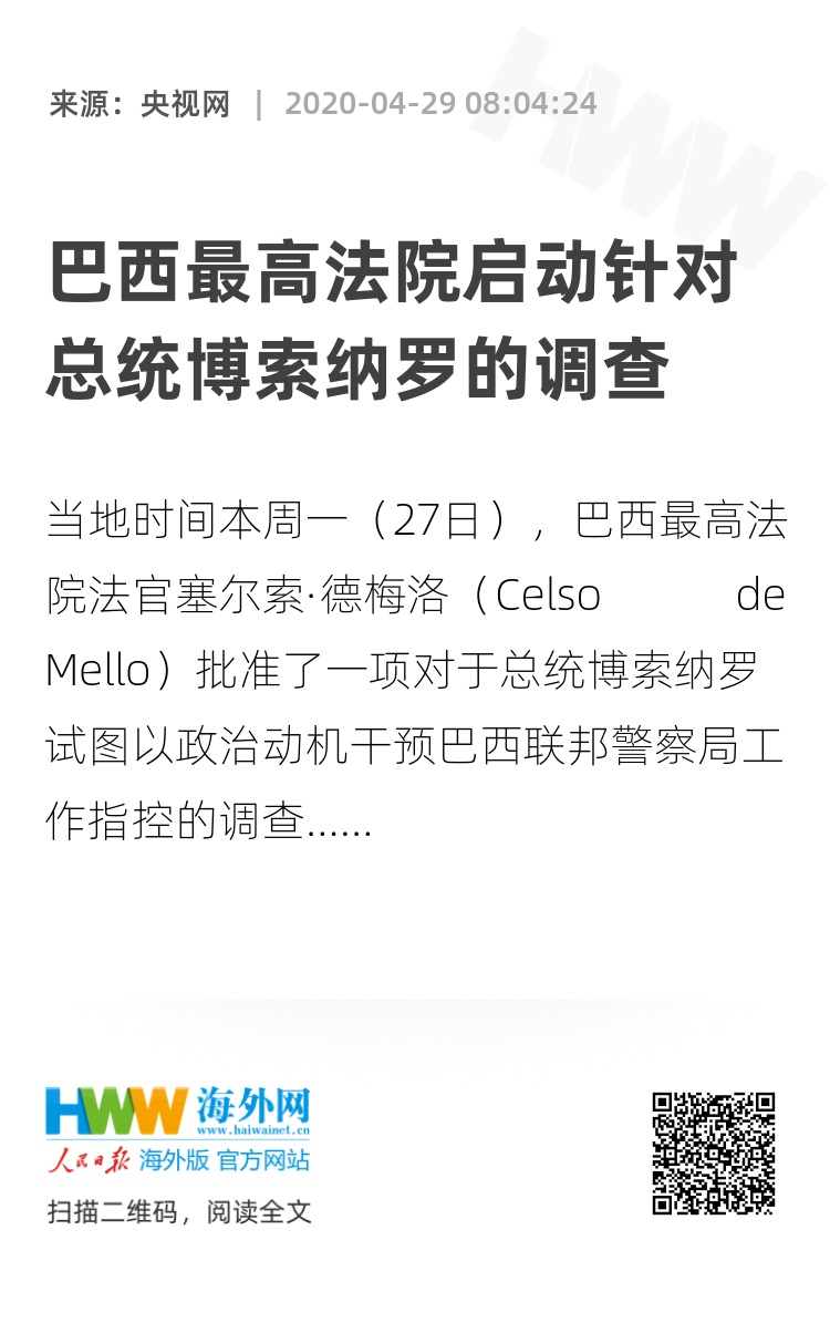 当地时间本周一(27日),巴西最高法院法官塞尔索·德梅洛(Celso de Mello)批准了一项对于总统博索纳罗试图以政治动机干预巴西联邦警察局工作指控的调查。