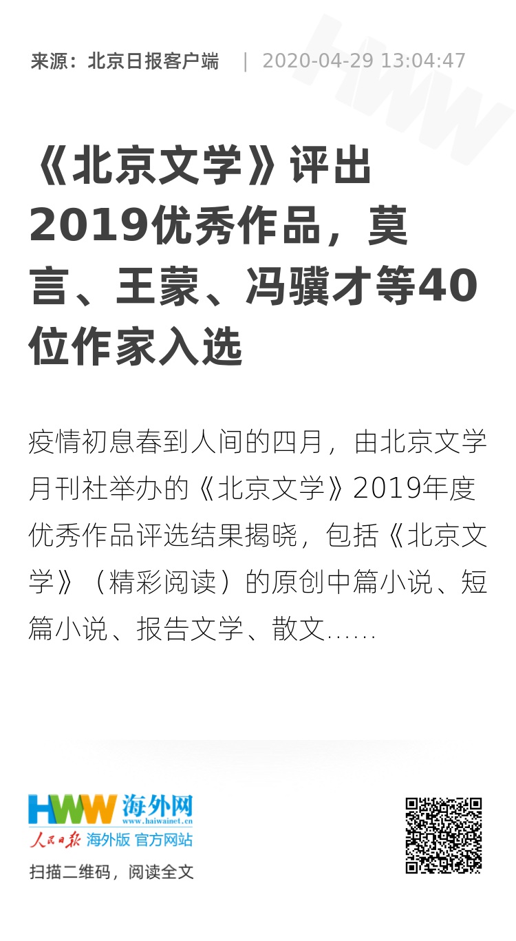 疫情初息春到人间的四月,由北京文学月刊社举办的《北京文学》2019年度优秀作品评选结果揭晓,包括《北京文学》(精彩阅读)的原创中篇小说、短篇小说、报告文学、散文、诗歌、评论6大门类的 30 篇作品和《北京文学•中篇小说月报》转载的10部中篇小说入选。中篇小说有尤凤伟《遗忘》,陶纯《前程似锦》,杨少衡《暗自颤抖》,孙频《天体之诗》,孙睿《斗地主》;短篇小说有乔叶《头条故事》,莫言《饺子歌》,刘庆邦《叶落桃园》,王蒙《邮事》,冯骥才《木佛》;报告文学有杨黎光《英雄和他背后的英雄——“钢铁战士”麦贤得的人生之路》,陈启文《穿越共和盆地》,陈应松《一个人的森林》,周建新《腾笼换鸟——中国首家央企子公司破产重整纪事》,长江《明月村的“月亮”》;散文有陆春祥《惊蛰》,杨海蒂《北面山河》,漆剑荣《皮鞋》,刘齐《玫瑰已高过屋顶》,普天《北京,北京》,蒋子龙《世相札记》,梁衡《将军几死却永生》,刘厦《独白》;诗歌有谷禾《春日篇》,艾川《与石头商榷》,西川《西川的诗》,梁平《天高地厚》,轩辕轼轲《轩辕轼轲新作》等作品,获得评委好评。马卓《告密者》与90后理工男贺泳迪《尸子》两部小说入选新人新作优秀作品。