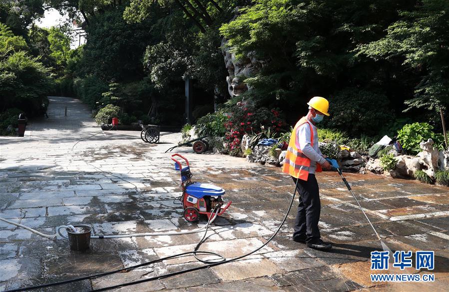 4月28日,施工人员在清理黄鹤楼景区内的道路。 4月29日,武汉黄鹤楼景区将重新开放,每天限流5400人次,目前只开放室外区域,全封闭区域暂不开放。游客入园前要扫描健康码并进行体温测量,佩戴口罩入园游览。 新华社发(赵军 摄)