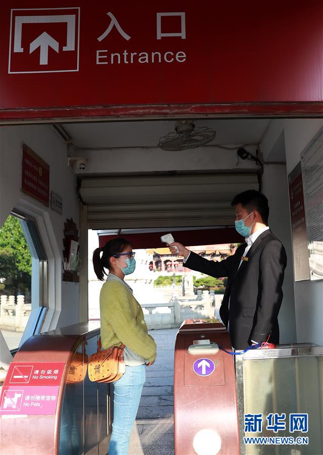 4月28日,黄鹤楼工作人员模拟游客进入景区前进行体温测量。 4月29日,武汉黄鹤楼景区将重新开放,每天限流5400人次,目前只开放室外区域,全封闭区域暂不开放。游客入园前要扫描健康码并进行体温测量,佩戴口罩入园游览。 新华社发(赵军 摄)