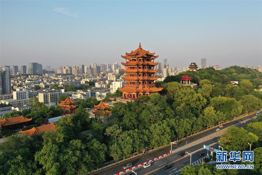 4月28日拍摄的即将恢复开放的武汉黄鹤楼景区(无人机照片)。 4月29日,武汉黄鹤楼景区将重新开放,每天限流5400人次,目前只开放室外区域,全封闭区域暂不开放。游客入园前要扫描健康码并进行体温测量,佩戴口罩入园游览。 新华社发(赵军 摄)