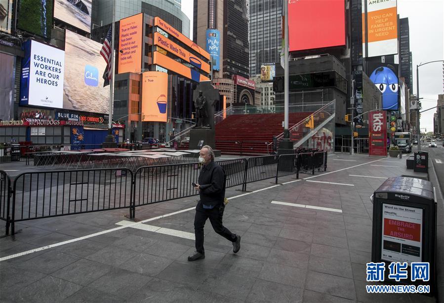 4月27日,在美国纽约,一名戴口罩的行人走过时报广场。 美国约翰斯·霍普金斯大学28日发布的新冠疫情最新统计数据显示,美国累计新冠确诊病例超过100万例。 新华社发 (郭克 摄)