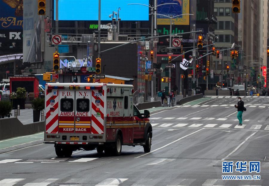 4月27日,在美国纽约,一辆救护车从时报广场驶过。 美国约翰斯·霍普金斯大学28日发布的新冠疫情最新统计数据显示,美国累计新冠确诊病例超过100万例。 新华社发 (郭克 摄)