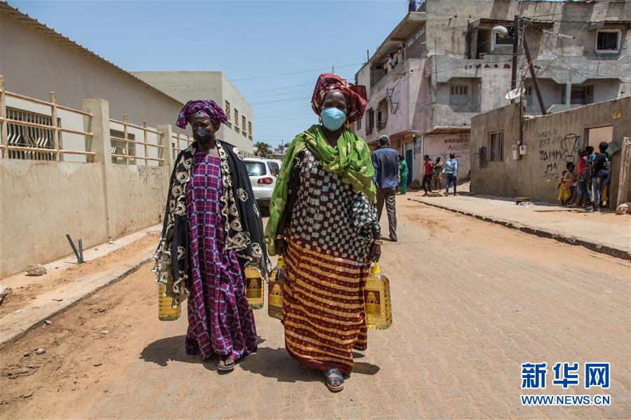 4月28日,在塞内加尔首都达喀尔附近的皮金市,两名妇女提着领取到的食用油走在街上。 塞内加尔自28日起向受疫情影响的低收入家庭分发粮食等生活物资。截至28日,塞内加尔累计报告确诊病例823例,死亡9例,治愈296例。 新华社发(埃迪·彼得斯摄)