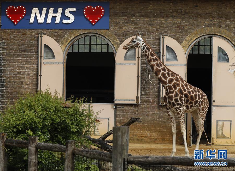4月29日,在英国伦敦动物园,一只长颈鹿走出圈舍。感谢NHS(英国国民保健制度)医护工作者的标识挂在外墙上。 因新冠疫情,伦敦动物园已关闭数周。 新华社记者 韩岩 摄