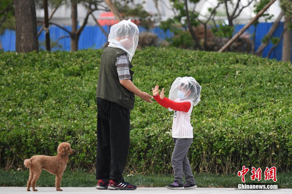 4月29日,北京,小朋友头戴防护面罩和家长玩耍。当日,北京市人民政府副秘书长陈蓓29日在发布会上表示,自4月30日零时起,将北京突发公共卫生事件一级响应调整为二级。中新社记者 张兴龙 摄