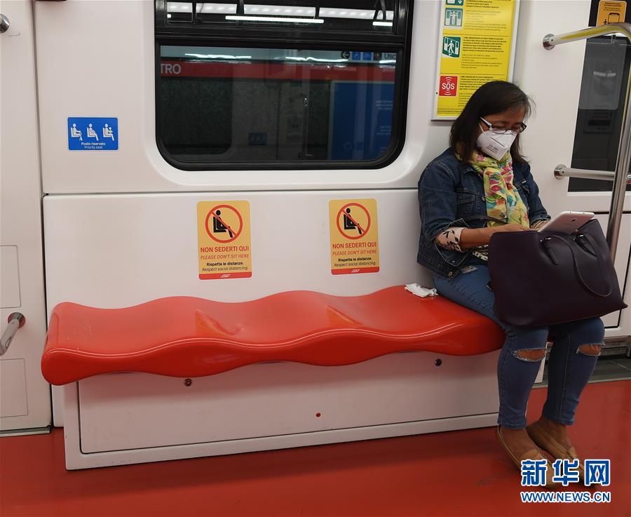 为了保证乘客的社交距离,避免新冠病毒的传播,意大利米兰的地铁车厢内增贴了一系列标识,提醒乘客在车厢内保持距离。 新华社发
