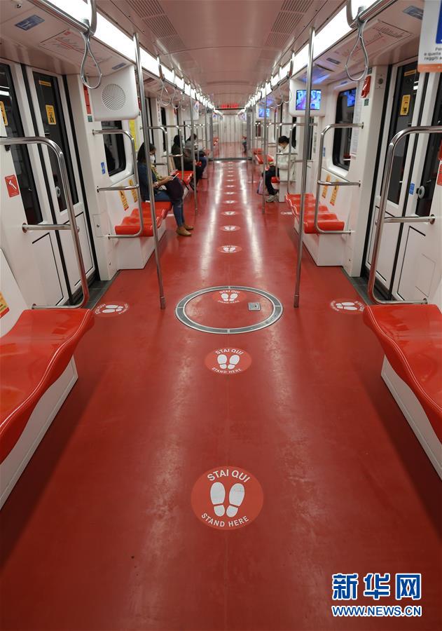 为了保证乘客的社交距离,避免新冠病毒的传播,意大利米兰的地铁车厢内增贴了一系列标识,提醒乘客在车厢内保持距离。 新华社发