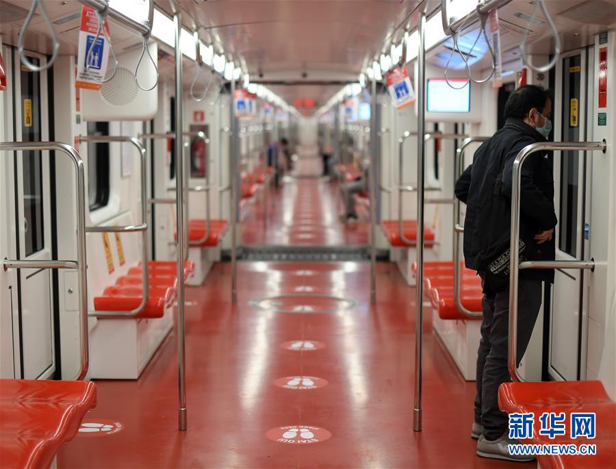 为了保证乘客的社交距离,避免新冠病毒的传播,意大利米兰的地铁车厢内增贴了一系列标识,提醒乘客在车厢内保持距离。 新华社发
