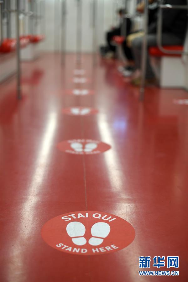 为了保证乘客的社交距离,避免新冠病毒的传播,意大利米兰的地铁车厢内增贴了一系列标识,提醒乘客在车厢内保持距离。 新华社发