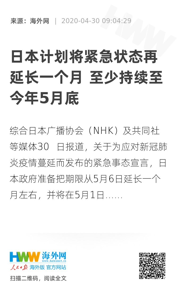 【海外网4月30日|战疫全时区】综合日本广播协会(NHK)及共同社等媒体30 日报道,关于为应对新冠肺炎疫情蔓延而发布的紧急事态宣言,日本政府准备把期限从5月6日再延长一个月左右,并将在5月1日召开的专家会议听取意见,日本首相安倍晋三准备在5月5日之前正式作出判断。