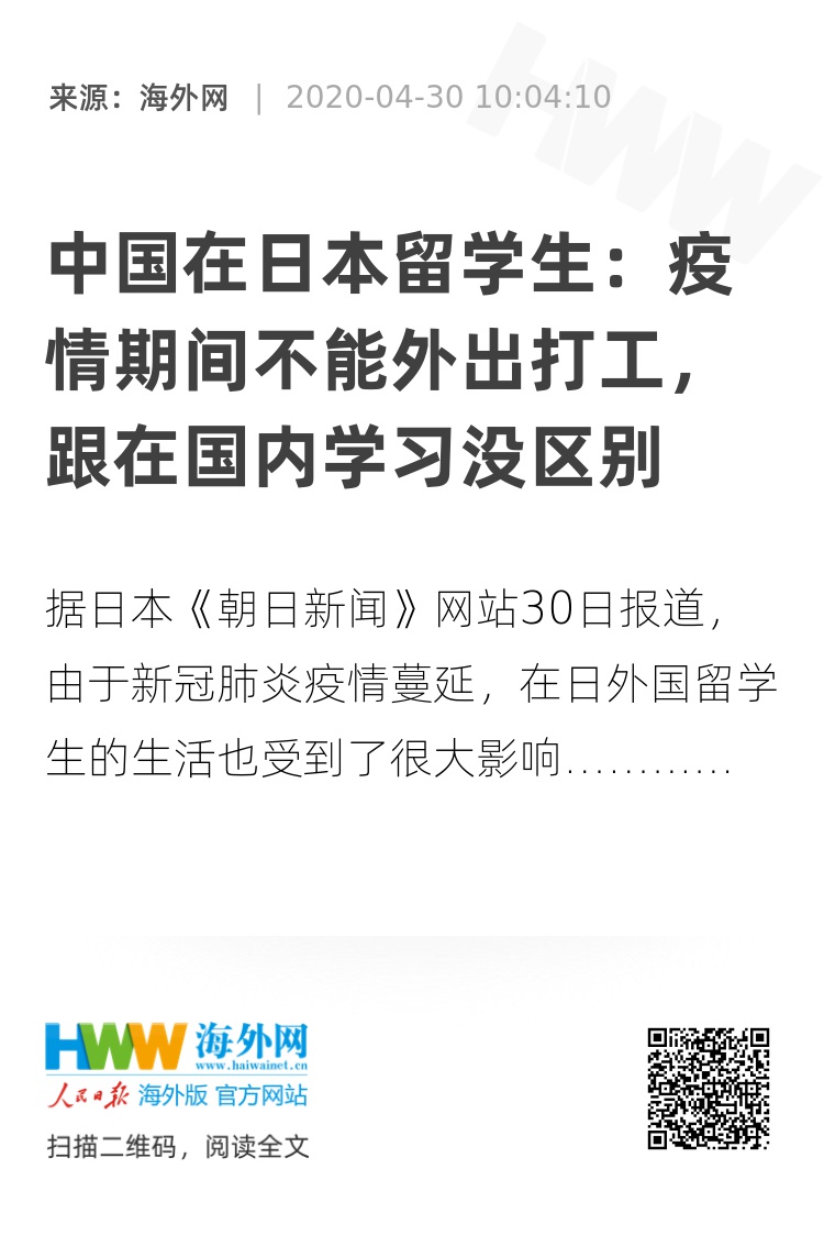 【海外网4月30日|战疫全时区】据日本《朝日新闻》网站30日报道,由于新冠肺炎疫情在日本多地蔓延,很多外国留学生的生活也受到了很大影响。