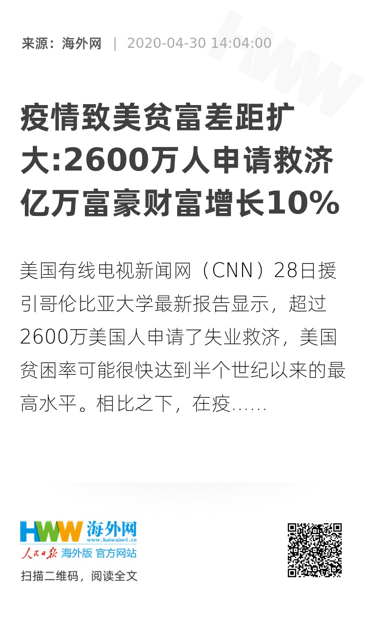 【海外网4月30日|战疫全时区】美国正遭受着一场可怕的疫情,尽管病毒本身分不出穷人富人,但因病毒受到经济影响,却存在着巨大差异。美国有线电视新闻网(CNN)28日援引哥伦比亚大学最新报告显示,超过2600万美国人申请了失业救济,美国贫困率可能很快达到半个世纪以来的最高水平。相比之下,在疫情暴发短短三周里,美国亿万富翁的财富却增加近10%。