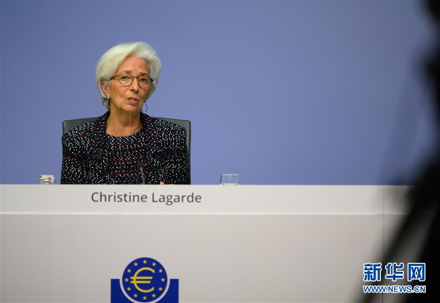 4月30日,在德国法兰克福的欧洲中央银行总部,欧洲央行行长拉加德在新闻发布会上介绍情况。 由于新冠疫情打击经济并增加不确定性,欧洲中央银行4月30日决定降低长期定向再融资操作利率,以加大对欧元区的流动性支持。 新华社发(欧洲中央银行供图)
