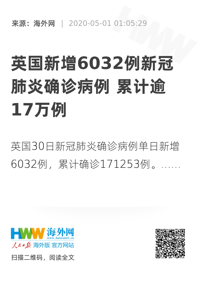 【海外网5月1日|战疫全时区】据英国卫生部门当地时间4月30日发布的数据,英国新冠肺炎单日新增6032例,累计确诊171253例;新增死亡674例,累计死亡26771例。(海外网 王西洛)
