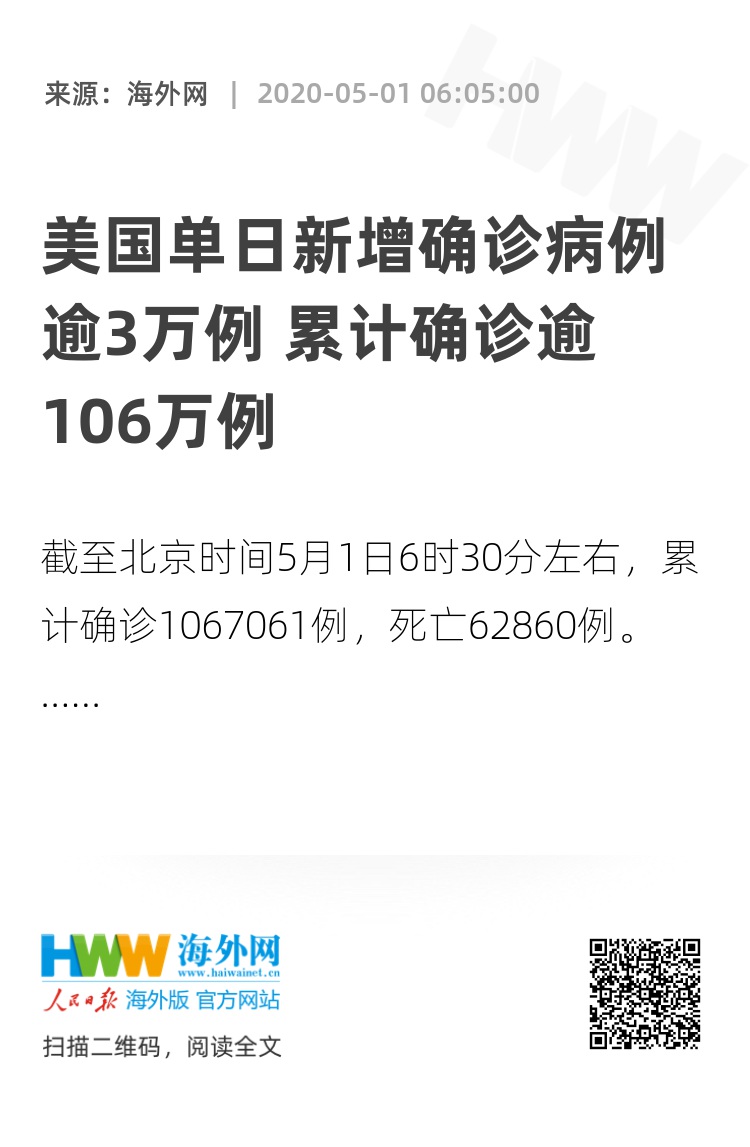 【海外网5月1日|战疫全时区】据美国约翰斯·霍普金斯大学数据实时数据显示,截至北京时间5月1日6时30分左右,全球累计确诊超327万例,达3271692例,累计死亡232817例。其中美国累计确诊1067061例,死亡62860例。与前一日6时30分数据相比,美国新增确诊病例30409例,新增死亡病例2385例。
