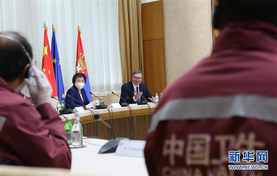 5月1日,在塞尔维亚首都贝尔格莱德,塞尔维亚总统武契奇与中国赴塞抗疫医疗专家组成员等会谈。 塞尔维亚总统武契奇1日说,在中国的帮助下,塞尔维亚新冠疫情逐渐稳定,塞方将进一步推进两国在经贸领域合作。 新华社记者石中玉摄