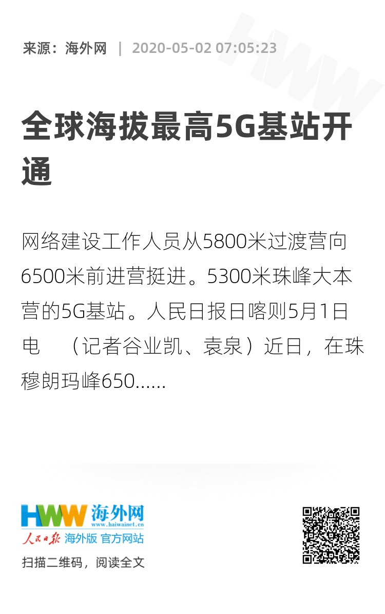 人民日报日喀则5月1日电 (记者谷业凯、袁泉)近日,在珠穆朗玛峰6500米前进营地,中国移动联合华为成功完成全球海拔最高5G基站的建设及开通工作,实现珠峰峰顶5G覆盖。同时,F5G千兆光纤网络也实现了6500米的同步开通。