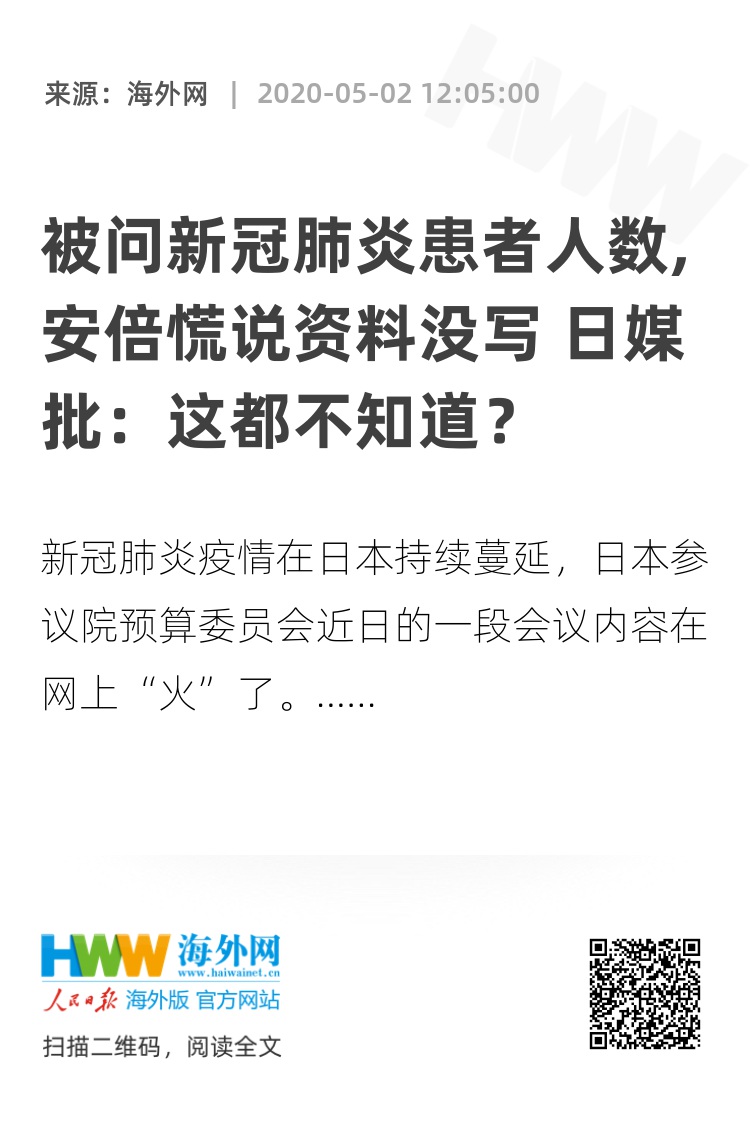 【海外网5月2日|战疫全时区】新冠肺炎疫情在日本持续蔓延,日本参议院预算委员会近日的一段会议内容在网上“火”了。国民民主党的议员森裕子在会上问日本首相安倍晋三“日本到底有多少人感染新冠肺炎”,视频画面显示,现场几乎“静止”一分钟之后,安倍才结巴回答“我这里资料上没写”。多家日媒指出,这本是负责人理应了解的事情。