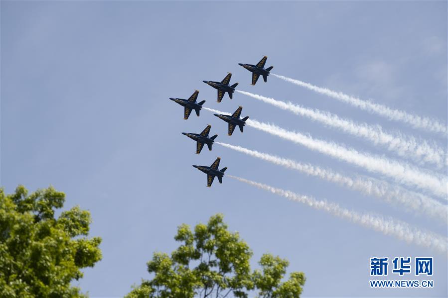 5月2日,“蓝天使”飞行表演队飞过美国首都华盛顿上空。 当日,美国空军“雷鸟”飞行表演队和海军“蓝天使”飞行表演队编队飞过华盛顿及周边区域,向抗击新冠疫情一线的医护人员和关键行业员工致敬。 新华社记者刘杰摄