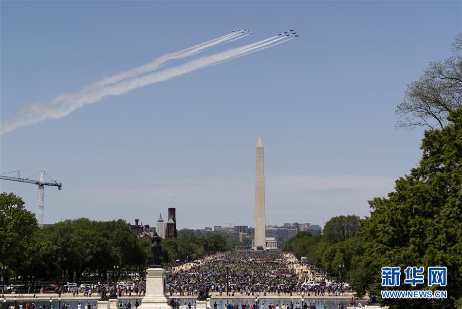 5月2日,“雷鸟”和“蓝天使”飞行表演队编队飞过美国首都华盛顿上空。 当日,美国空军“雷鸟”飞行表演队和海军“蓝天使”飞行表演队编队飞过华盛顿及周边区域,向抗击新冠疫情一线的医护人员和关键行业员工致敬。 新华社发(沈霆摄)