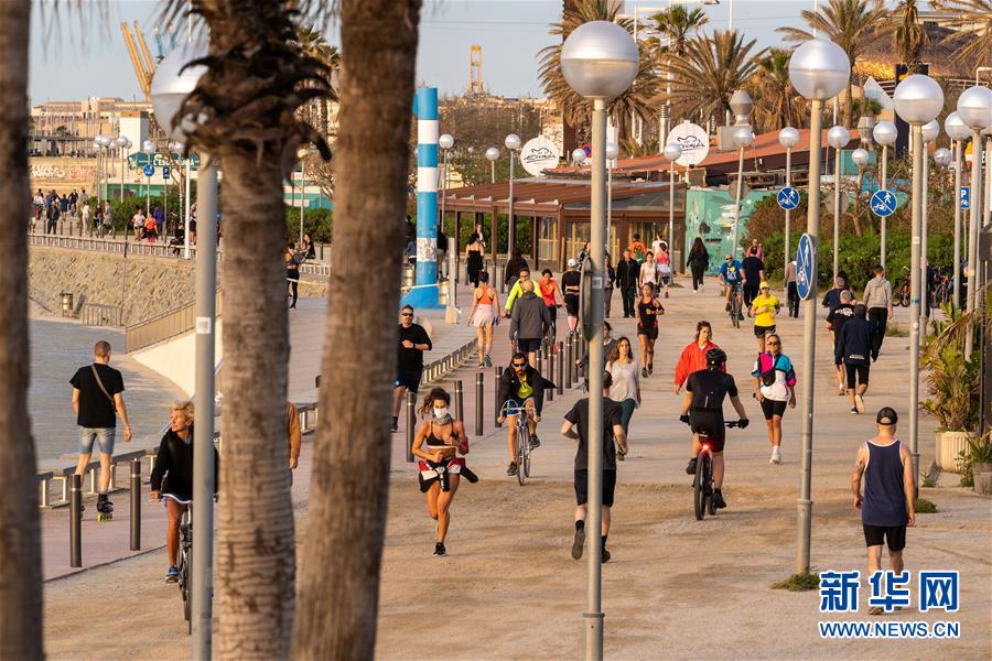 5月2日,市民在西班牙巴塞罗那博加特尔海滩锻炼身体。 根据西卫生部4月30日宣布的一项新规定,从5月2日起,全国“禁足令”将进一步放松,民众可每天短暂走出家门进行体育锻炼等活动,出门时段根据年龄段划分。 新华社发(胡安·戈萨摄)