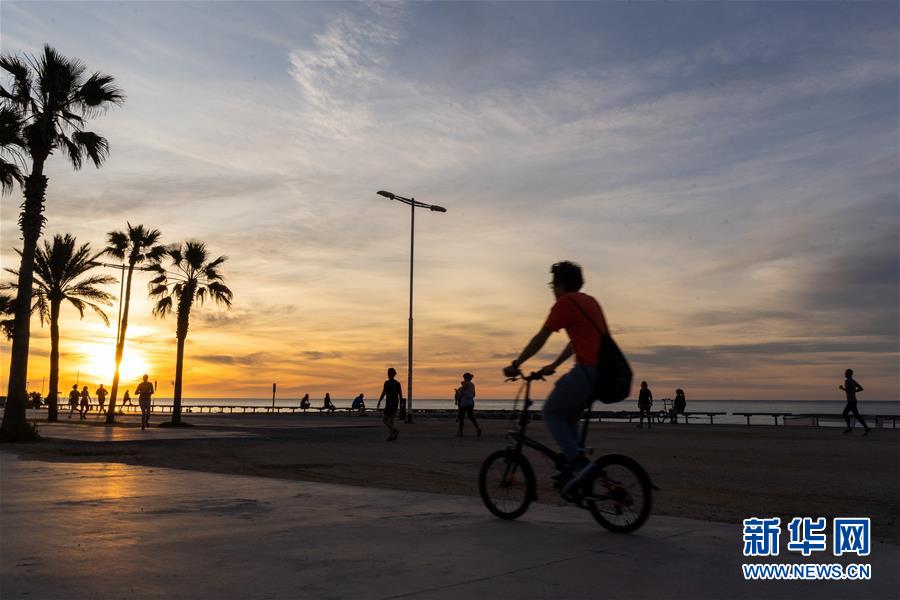 5月2日,市民在西班牙巴塞罗那博加特尔海滩锻炼身体。 根据西卫生部4月30日宣布的一项新规定,从5月2日起,全国“禁足令”将进一步放松,民众可每天短暂走出家门进行体育锻炼等活动,出门时段根据年龄段划分。 新华社发(胡安·戈萨摄)
