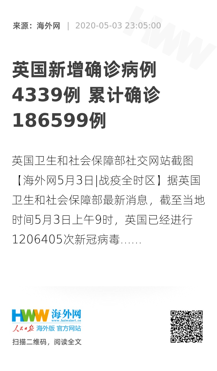【海外网5月3日|战疫全时区】据英国卫生和社会保障部最新消息,截至当地时间5月3日上午9时,英国已经进行1206405次新冠病毒检测,总共有882343人接受检测。5月2日,英国新增新冠肺炎确诊病例4339例,新增死亡病例315例,累计确诊病例186599例,累计死亡病例28446例。