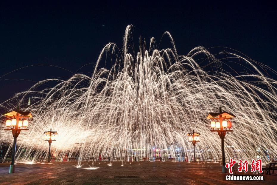 长沙古镇上演铁花焰火秀 流光溢彩美艳夜空