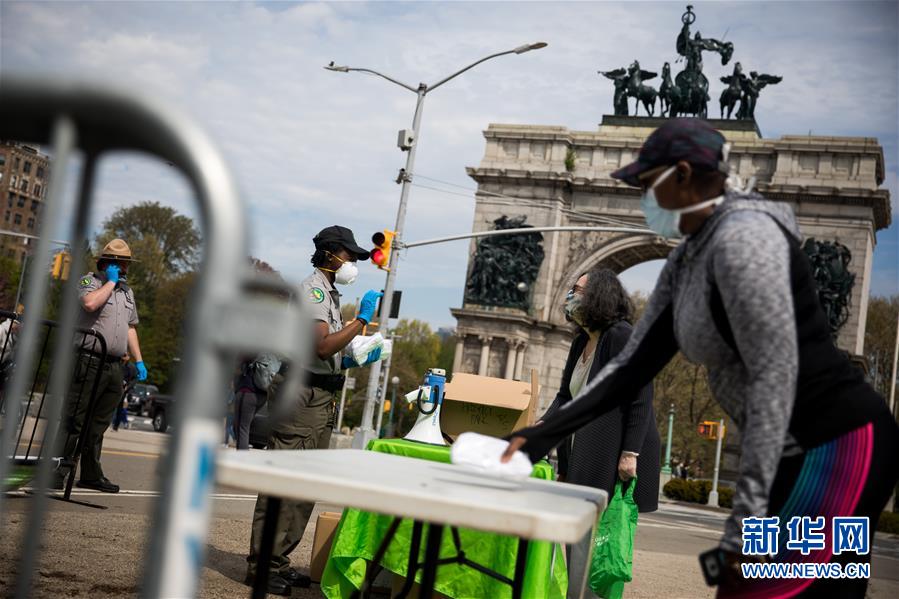 5月3日,在美国纽约,工作人员在一个公园里向市民发放口罩。 美国约翰斯·霍普金斯大学3日发布的新冠疫情最新统计数据显示,全球累计确诊病例超过350万例。数据显示,美国是疫情最严重的国家,累计确诊病例1156924例,累计死亡病例67498例。 新华社发(郭克摄)