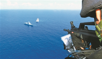 编队特战队员搭乘直升机进行空中火力支援演练。