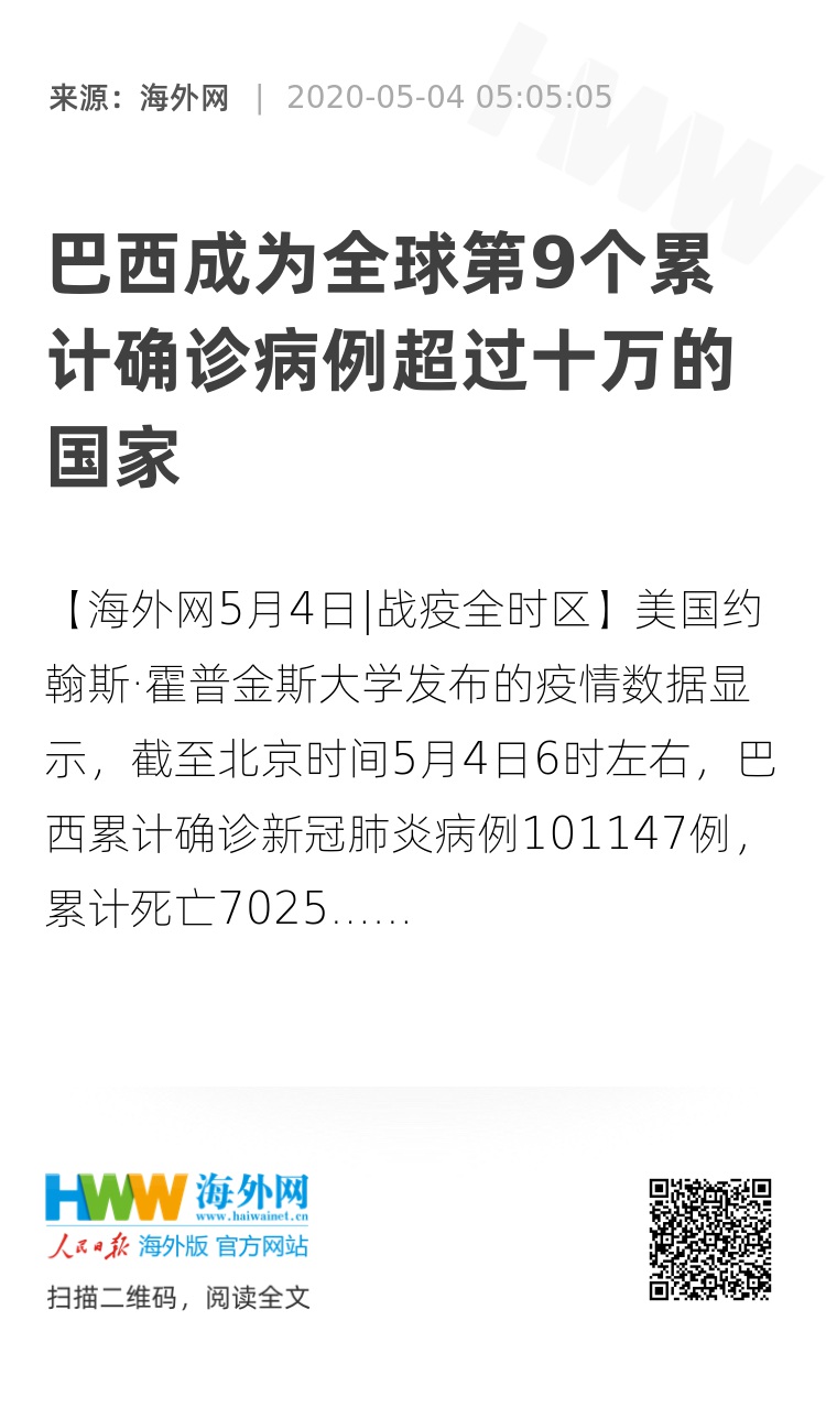 【海外网5月4日|战疫全时区】美国约翰斯·霍普金斯大学发布的疫情数据显示,截至北京时间5月4日6时左右,巴西累计确诊新冠肺炎病例101147例,累计死亡7025例。巴西成为继美国、西班牙、意大利、英国、法国、德国、俄罗斯、土耳其之后,第9个累计确诊病例超过十万的国家。(海外网 陈亚楠)