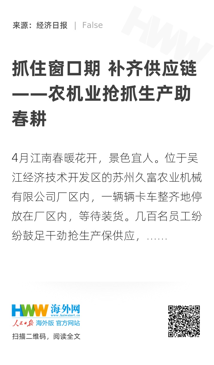 “这次疫情暴露出我们企业供应链存在很多短板。”徐正华说,复工初期,上游零部件企业和下游整机生产企业都面临着无法及时提供货源的问题。为了及时获得零部件,久富不得不派人帮助零部件生产企业,缓解零部件企业生产压力。这场疫情使久富农机的危机应对意识大为提高,加快了二期厂房、设备、生产线的施工建设进度。同时,公司将科学储备物料,建立危机应对预案,以应对可能发生的新危机。(记者 刘 慧 通讯员 何学扣)