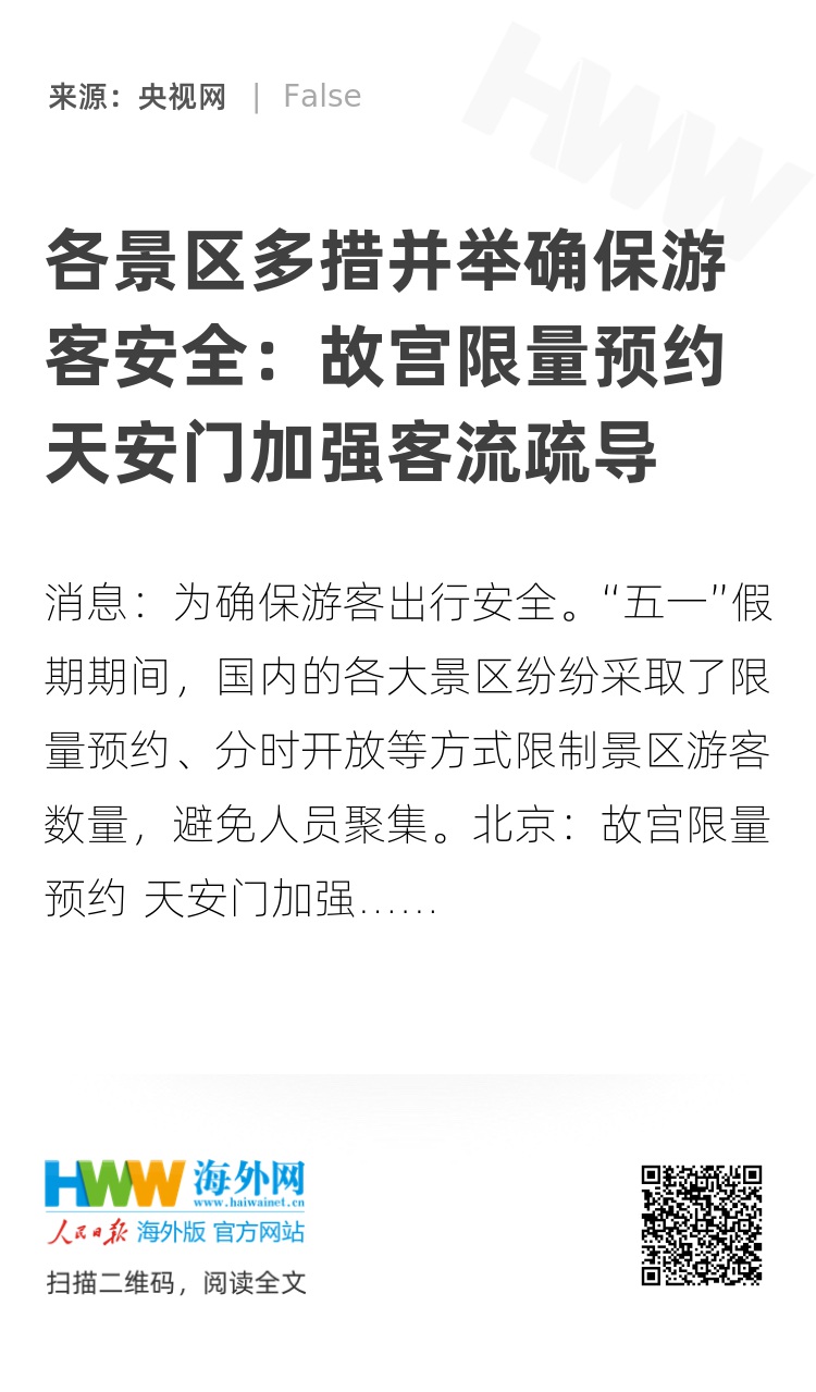 今年的“五一”假期,不少景区都施行了实名制预约,确保安全旅游。以故宫为例,故宫从五月一日起恢复开放,并实行预约参观,每日限额5000人。目前故宫博物院开放前三殿、后三宫等部分陈列殿宇,并采取殿外护栏隔离的参观方式。疫情防控期间,观众需要从东华门外经东筒子河前往故宫午门。同时,“五一”期间,北京警方也加强了天安门广场、过街通道等重点部位的客流疏导。