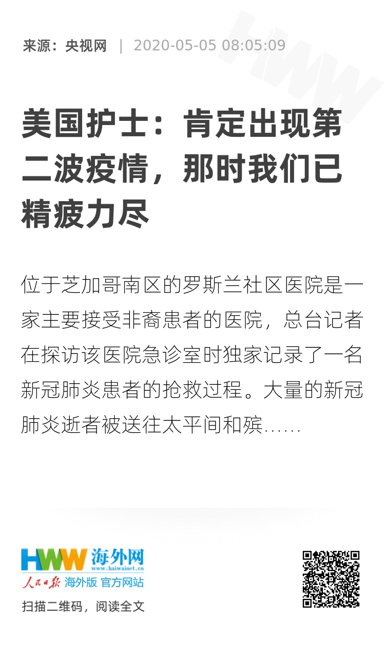 位于芝加哥南区的罗斯兰社区医院是一家主要接受非裔患者的医院,总台记者在探访该医院急诊室时独家记录了一名新冠肺炎患者的抢救过程。大量的新冠肺炎逝者被送往太平间和殡仪馆,他们的亲人好友根本没有机会告别。与此同时,美国各地正在迫不及待地重启经济,前线医务人员认为这将引发第二波疫情。