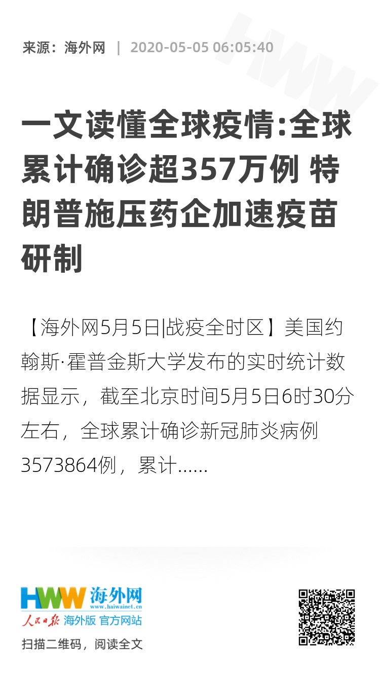 【海外网5月5日|战疫全时区】美国约翰斯·霍普金斯大学发布的实时统计数据显示,截至北京时间5月5日6时30分左右,全球累计确诊新冠肺炎病例3573864例,累计死亡250687例。