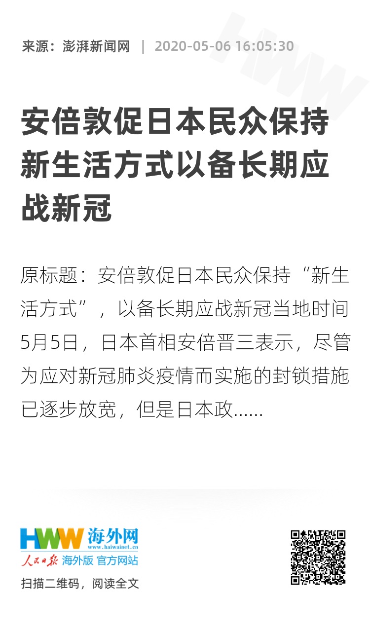 此前,安倍晋三和日本政府其他高级官员曾多次强调新冠肺炎大流行带来的长期影响,安倍4日的呼吁则是日本政府首次提供具体事例。