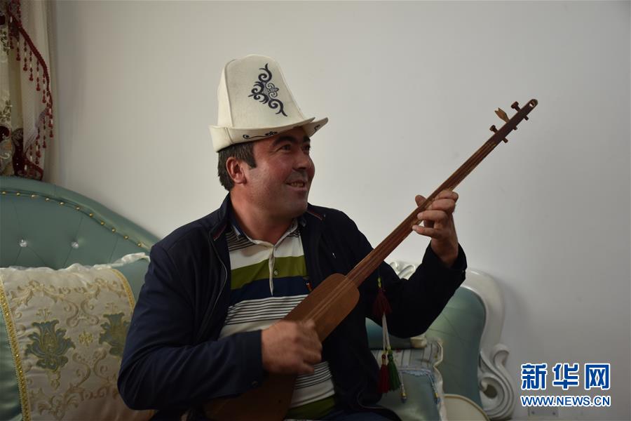 在新疆阿克陶县昆仑佳苑内,加力力·托兰在家中弹奏乐器(4月18日摄)。新华社记者 高晗 摄