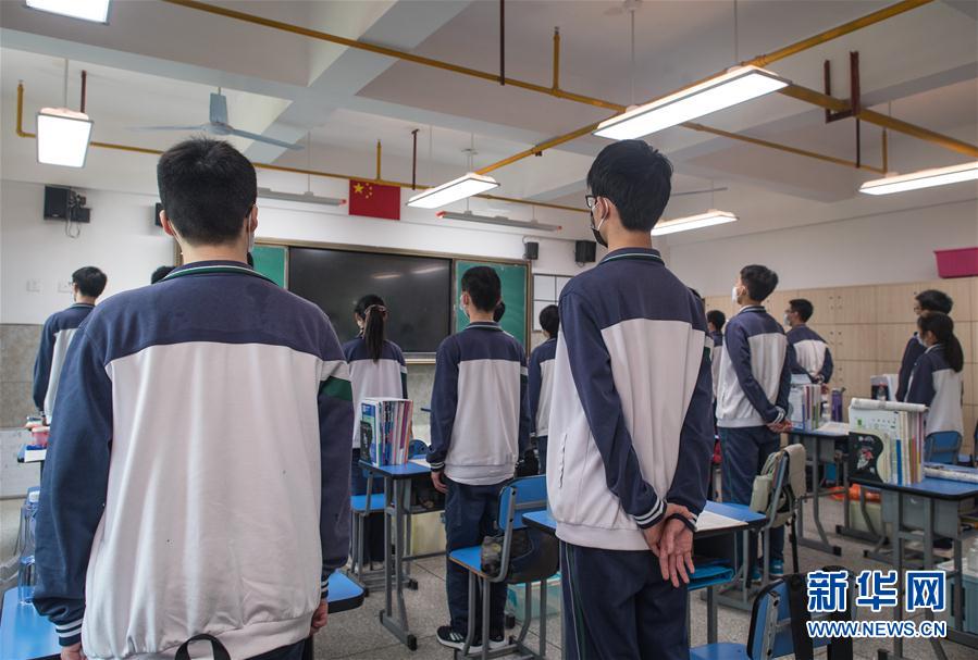 5月6日,武汉市第六中学的高三年级学生在教室内参加升旗仪式。 当日,武汉首批121所学校高三年级正式复学,学生返校上课。据了解,开学前,所有校园均开展了卫生清洁和预防性消杀工作,所有学生返校前须进行健康检测。 新华社记者 肖艺九 摄
