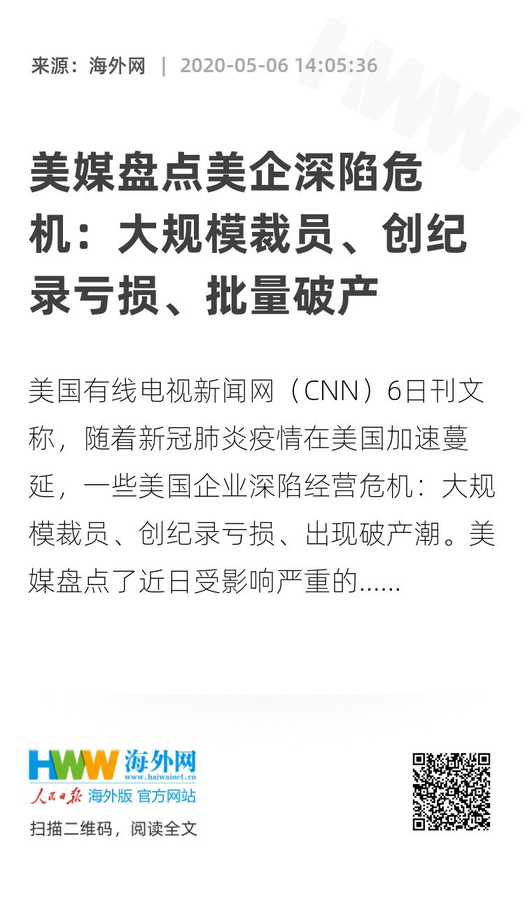 【海外网5月6日|战疫全时区】美国有线电视新闻网(CNN)6日刊文称,随着新冠肺炎疫情在美国加速蔓延,一些美国企业深陷经营危机:大规模裁员、创纪录亏损、出现破产潮。美媒盘点了近日受影响严重的企业名单,从零售、餐饮企业到航空、能源公司,涉及行业领域众多。