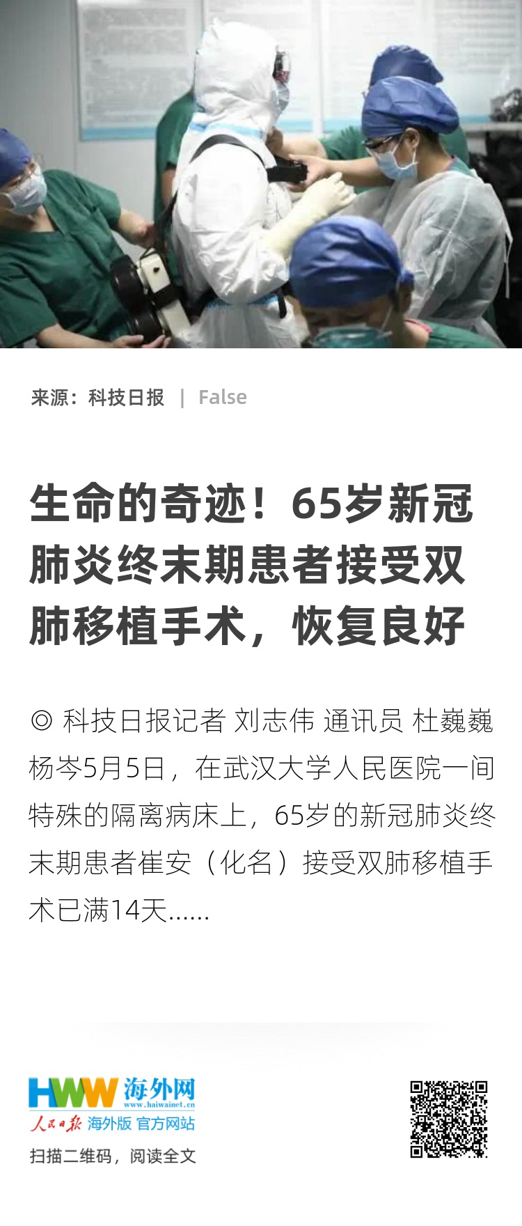 5月5日,在武汉大学人民医院一间特殊的隔离病床上,65岁的新冠肺炎终末期患者崔安(化名)接受双肺移植手术已满14天。他的恢复状态给予了所有人惊喜和欣慰。