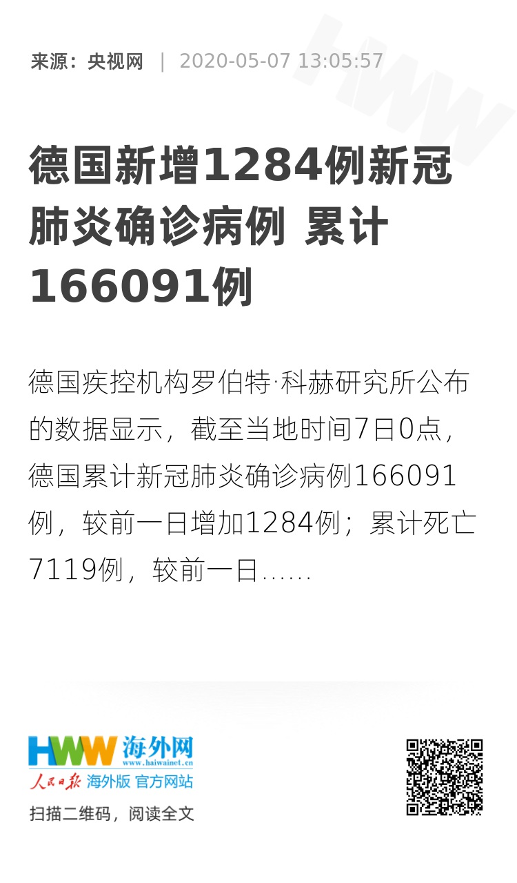 德国疾控机构罗伯特·科赫研究所公布的数据显示,截至当地时间7日0点,德国累计新冠肺炎确诊病例166091例,较前一日增加1284例;累计死亡7119例,较前一日增加123例;累计治愈约139900例。(总台记者 余鹏)