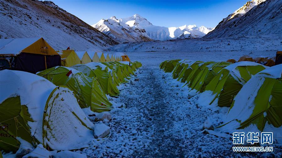 珠峰大本营的清晨,队员睡觉的帐篷上覆盖着积雪(5月3日摄)。新华社记者 普布扎西 摄