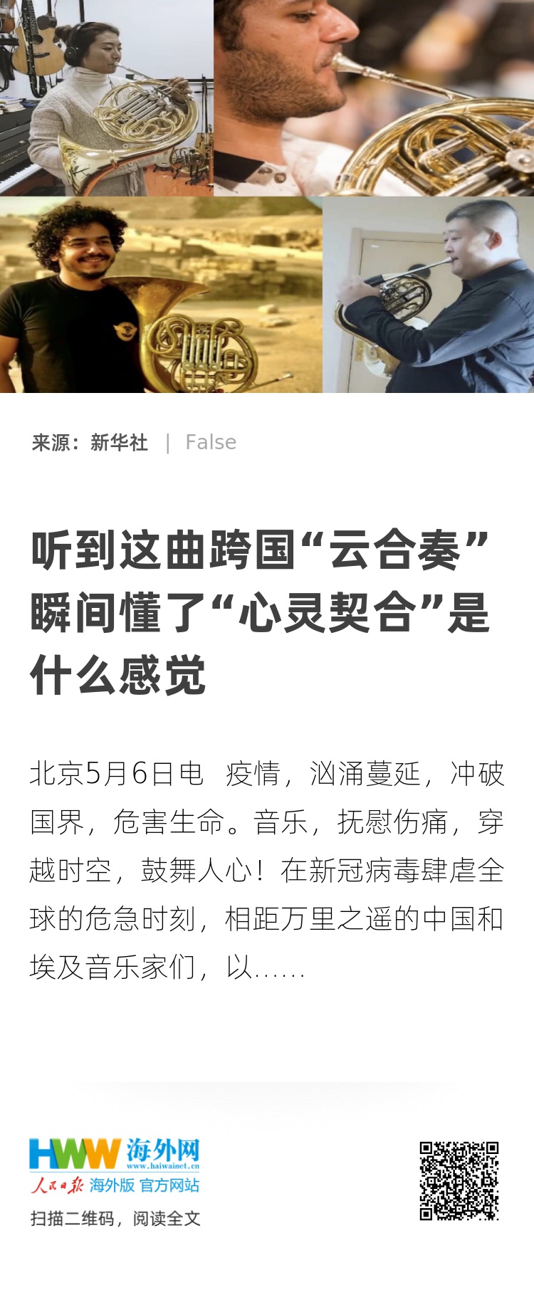 在新冠病毒肆虐全球的危急时刻,相距万里之遥的中国和埃及音乐家们,以独出心裁的“云合奏”方式,联袂演绎世界闻名的《凯旋进行曲》,用慷慨轩昂、象征胜利的交响乐激励人们沉着勇敢面对困境,乐观迎接战胜疫情的曙光。
