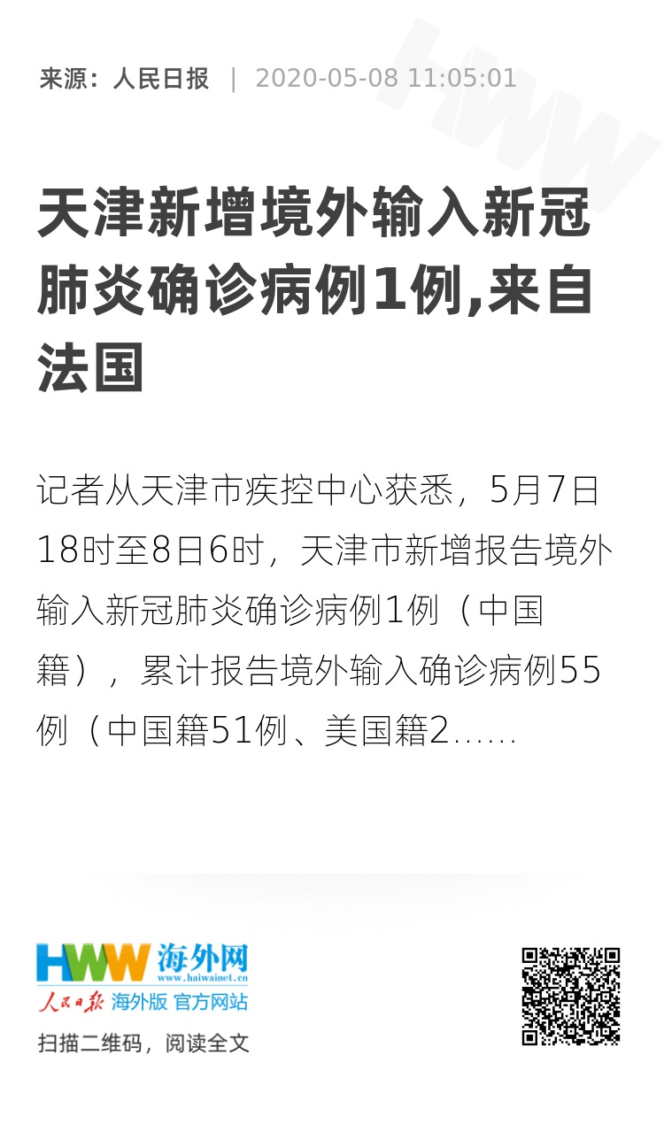 第55例境外输入病例,女,47岁,工程师,中国籍,居住地法国巴黎。该患者于5月7日从法国巴黎乘CA934航班到天津滨海国际机场,入境时体温36.4℃,申报有腹泻症状,送空港医院发热门诊排查;经鼻、咽拭子核酸检测结果为阳性,经市专家组确诊为境外输入病例,分型待定;现已转往海河医院,有关流行病学调查正在进行中。