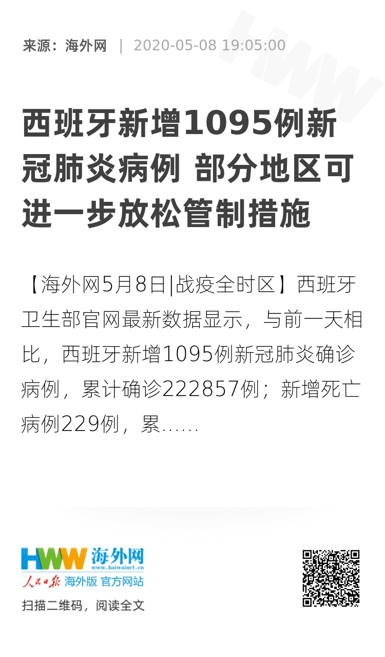 【海外网5月8日|战疫全时区】西班牙卫生部官网最新数据显示,与前一天相比,西班牙新增1095例新冠肺炎确诊病例,累计确诊222857例;新增死亡病例229例,累计死亡病例达26299例;累计康复131148人。目前西班牙卫生部官网只发布由PCR检测确诊的新冠肺炎数据。