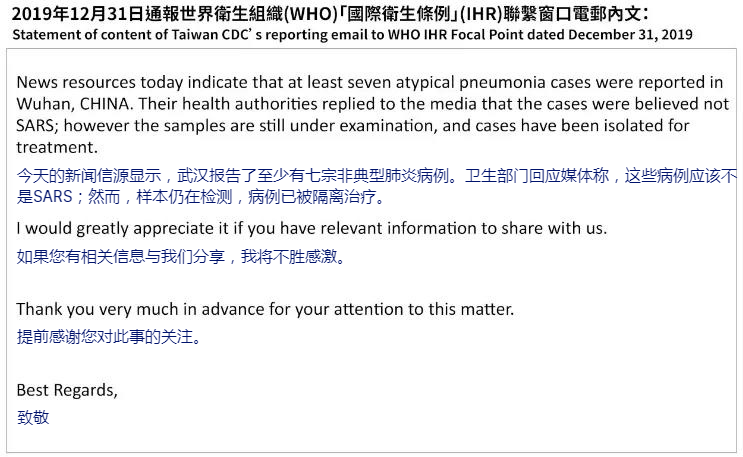 谎言17:台湾早在2019年12月31日就向世卫组织发出关于新冠肺炎人传人的警告,但未获得重视。