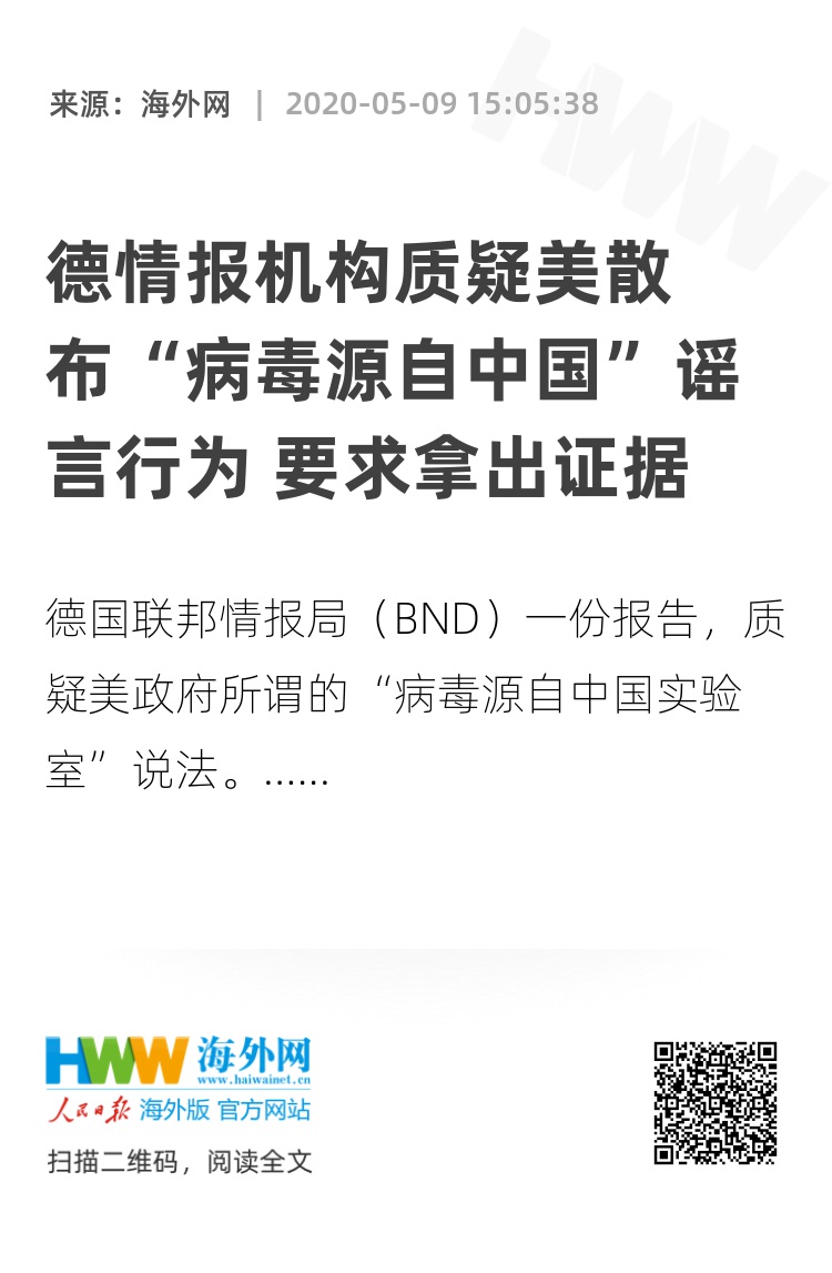 【海外网5月9日|战疫全时区】德国《明镜周刊》8日援引德国情报机构——德国联邦情报局(BND)一份报告,质疑美政府所谓的“病毒源自中国实验室”说法,称这只不过是一场精心策划的行动,为的就是转移外界对美国抗疫失败的注意力。