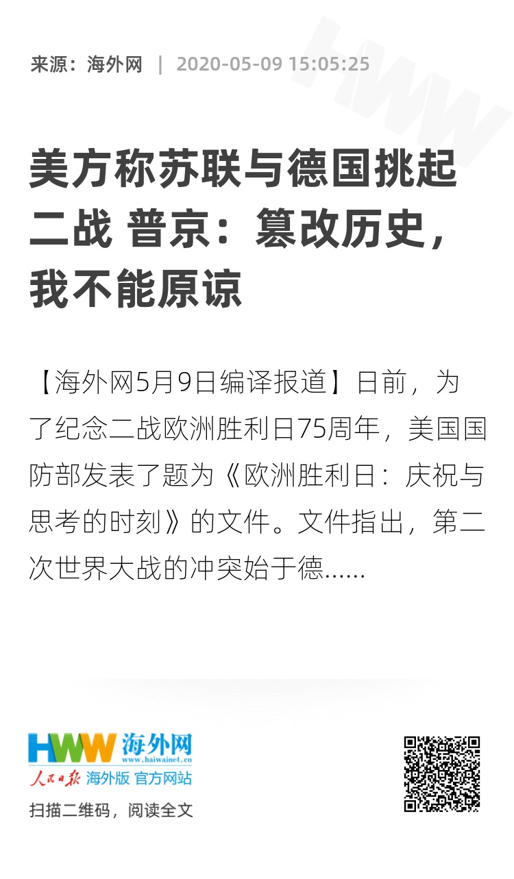 【海外网5月9日编译报道】日前,为了纪念二战欧洲胜利日75周年,美国国防部发表了题为《欧洲胜利日:庆祝与思考的时刻》的文件。文件指出,第二次世界大战的冲突始于德国和苏联“入侵”波兰之时。而对于苏联为反抗法西斯主义所做出的贡献,文件中却并未提及。