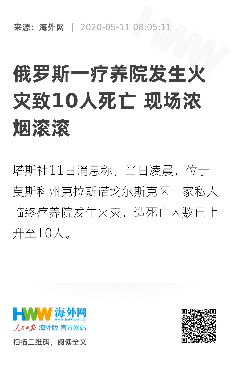 【海外网5月11日编译报道】塔斯社11日消息称,当日凌晨,位于莫斯科州克拉斯诺戈尔斯克区一家私人临终疗养院发生火灾,造死亡人数已上升至10人。